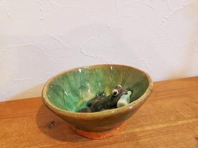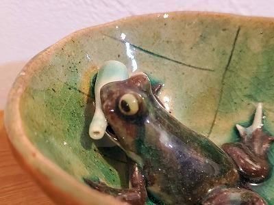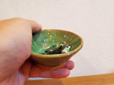 一升瓶咥えたカエルがどーんと真ん中にいるおちょこです。
