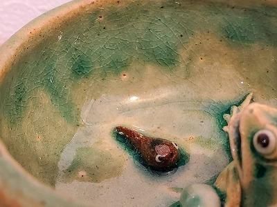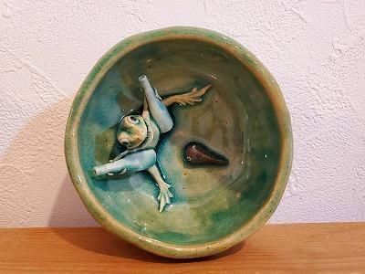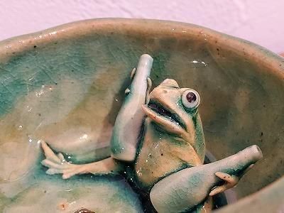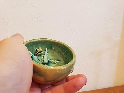 お酒大好きで一升瓶を両手にもつカエルちゃんと心配顔のおたまちゃんのおちょこです。